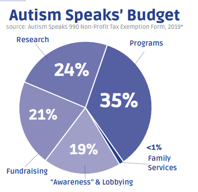 And then there’s the matter of “support”. Not all “charities” are created equal. If I hadn’t done some poking around, I may not have ever known that there is a massive pushback from autistic people against one of the most prominent “charities” around. Once I started digging deeper into this controversy it was easy to see that these grievances are not unfounded. If you’d like to know more about this issue you can click on the graph below.